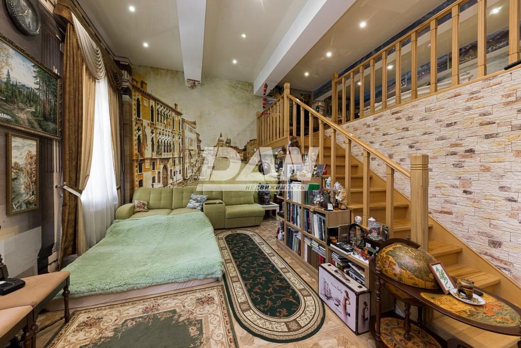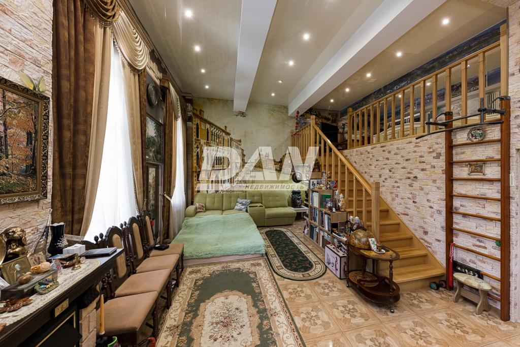 В квартире выполнена перепланировка. Высота потолков 4,5 метра. Это позволило устроить жилую антресоль, на которой разместились кабинет – спальня и просторная гардеробная. Все документы оформлены надлежащим образом. Площадь квартиры до перепланировки составляла 72,8 м в том числе: прихожая - 14,4 м, санузел - 1,1 м, ванна - 7,7 м , кухня – гостиная – 31,9 м, спальня 17,7 м. После перепланировки общая площадь составила 104,3 м в том числе: прихожая 7,5 м, санузел + ванна – 10,1м, кухня – 13,9, гостиная со вторым светом – 41,3м. На антресоли расположились кабинет –спальня – 21,5 м, и гардеробная – 10м