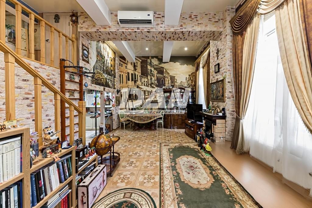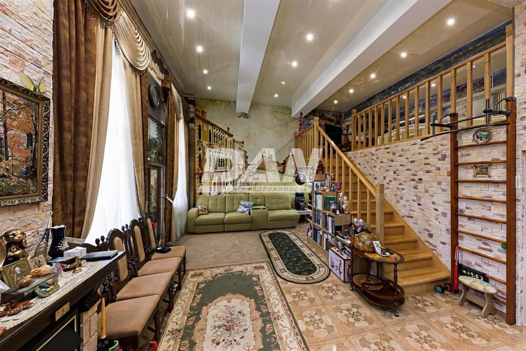 В квартире выполнена перепланировка. Высота потолков 4,5 метра. Это позволило устроить жилую антресоль, на которой разместились кабинет – спальня и просторная гардеробная. Все документы оформлены надлежащим образом. Площадь квартиры до перепланировки составляла 72,8 м в том числе: прихожая - 14,4 м, санузел - 1,1 м, ванна - 7,7 м , кухня – гостиная – 31,9 м, спальня 17,7 м. После перепланировки общая площадь составила 104,3 м в том числе: прихожая 7,5 м, санузел + ванна – 10,1м, кухня – 13,9, гостиная со вторым светом – 41,3м. На антресоли расположились кабинет –спальня – 21,5 м, и гардеробная – 10м