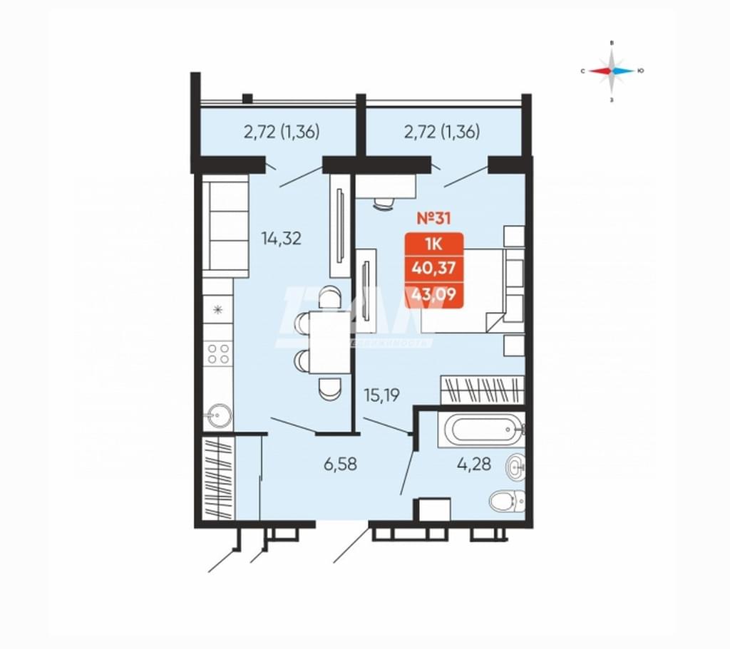 1-комнатная квартира, 43,3 м²