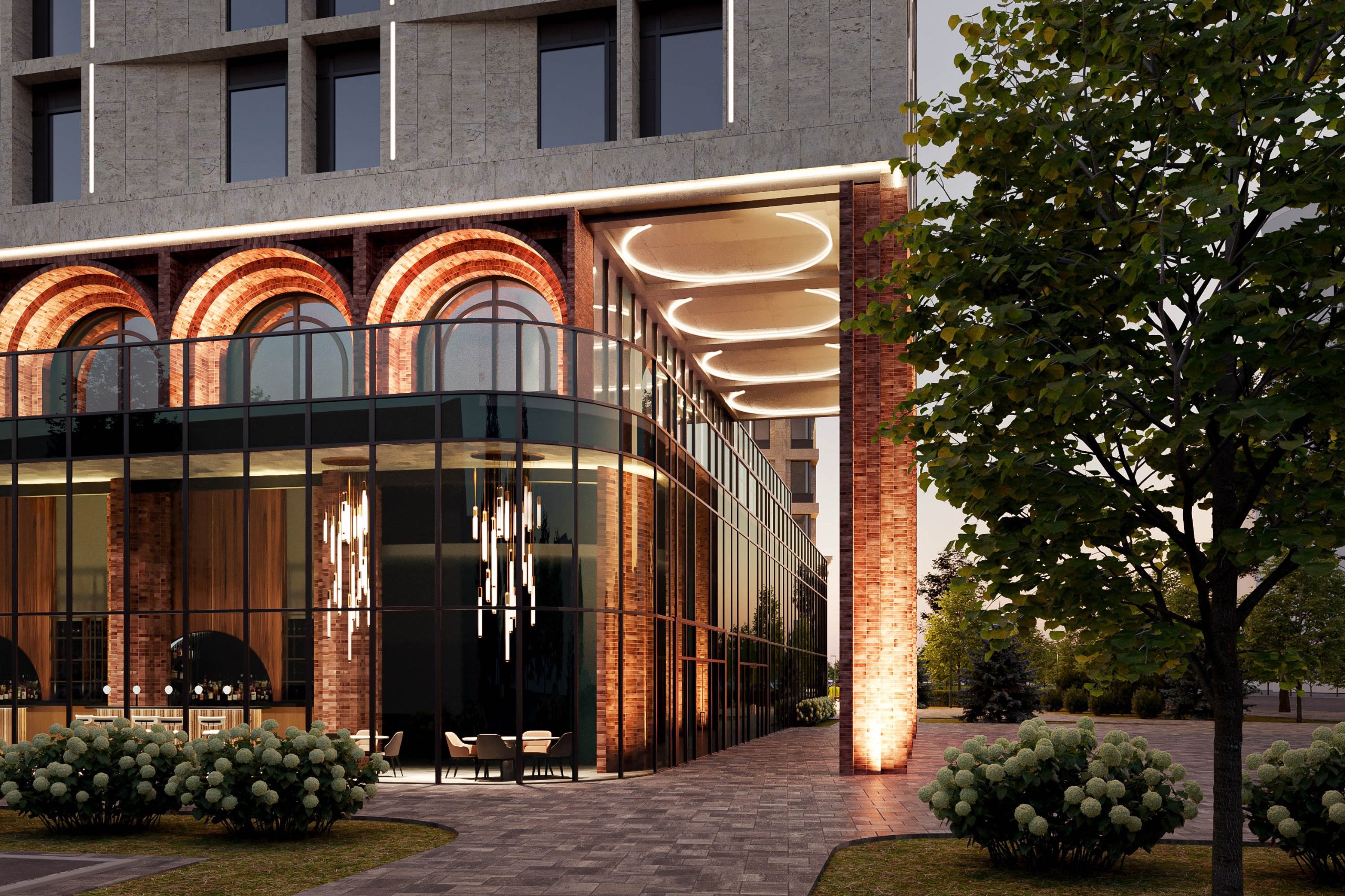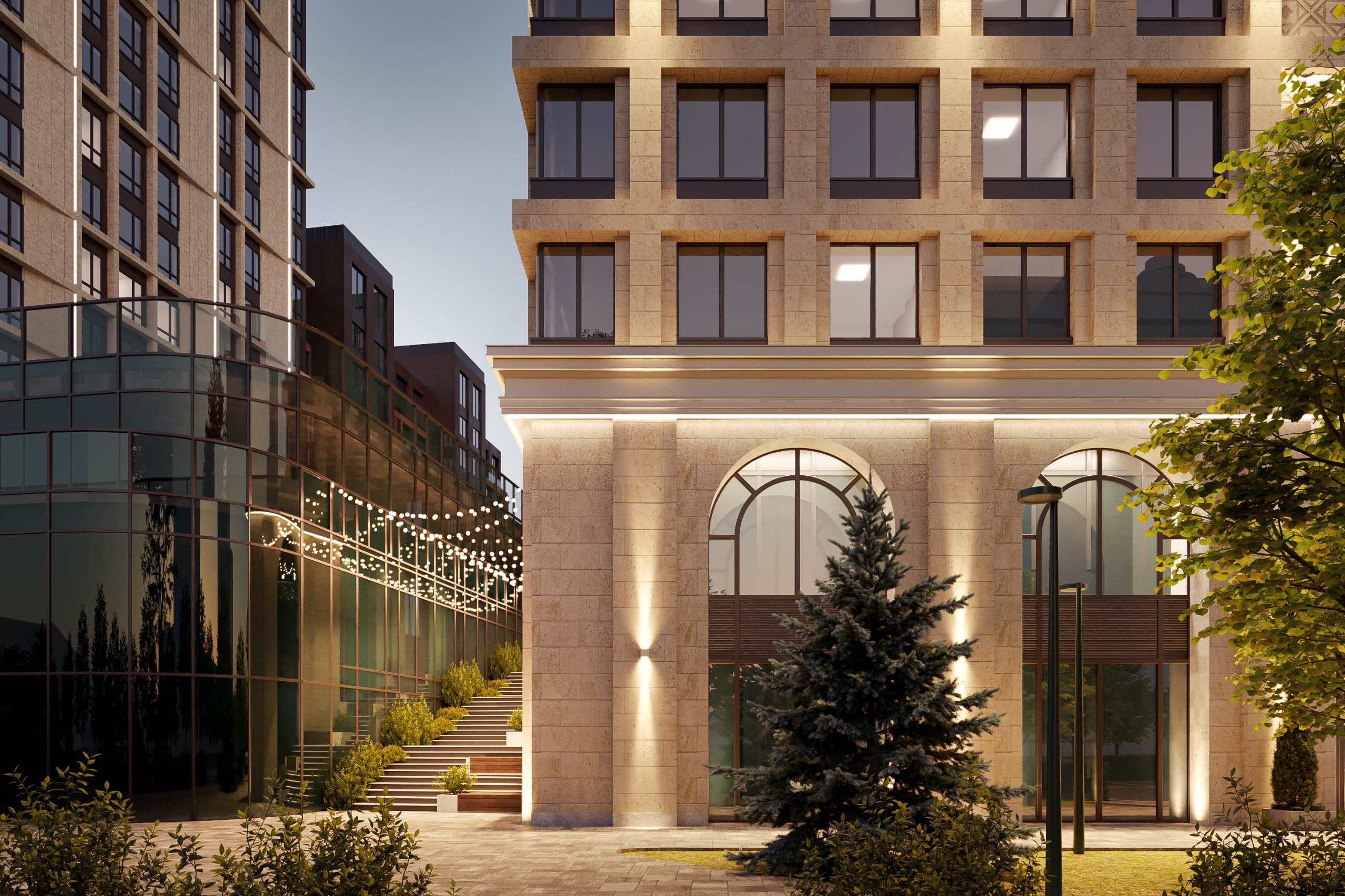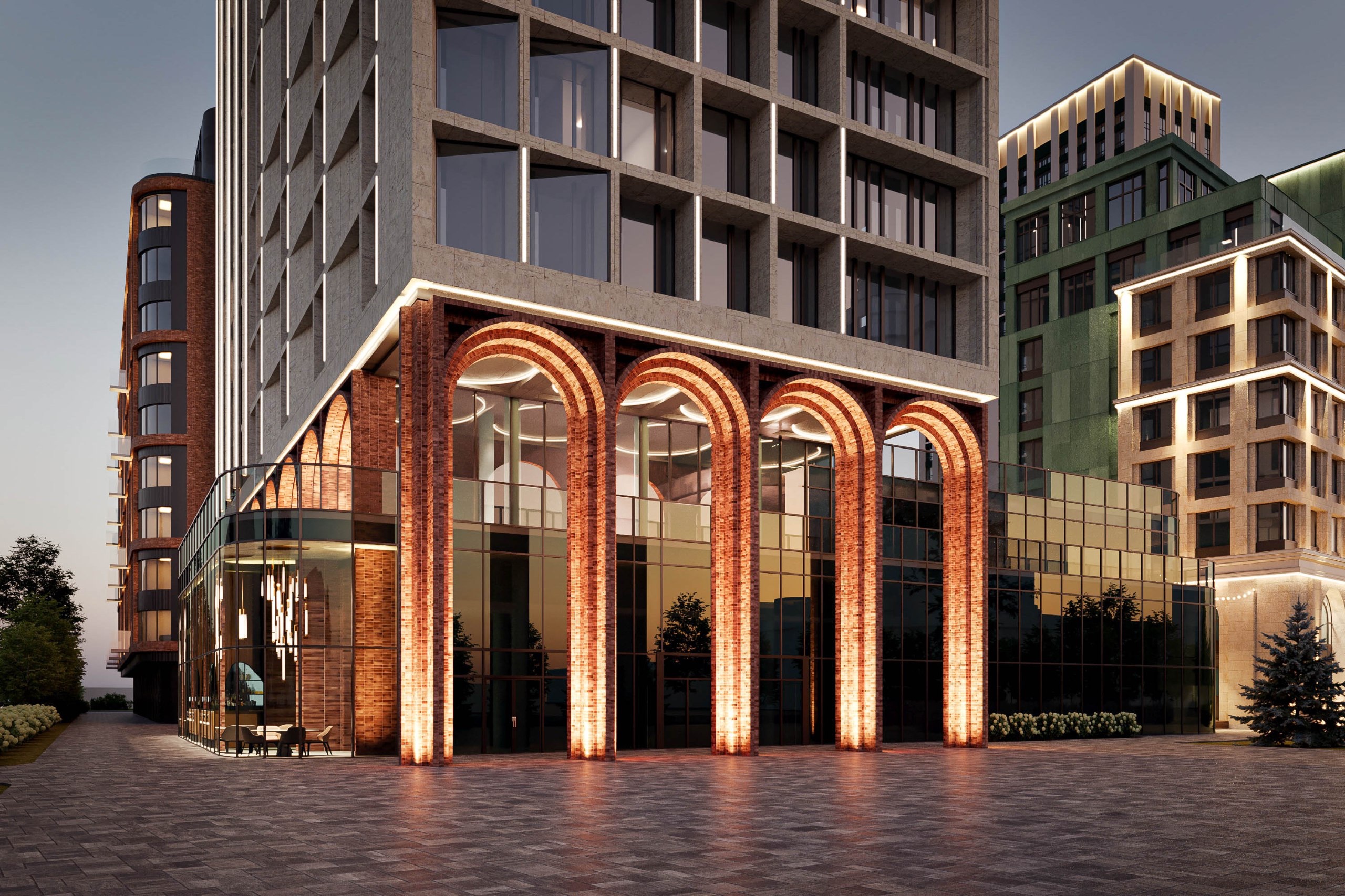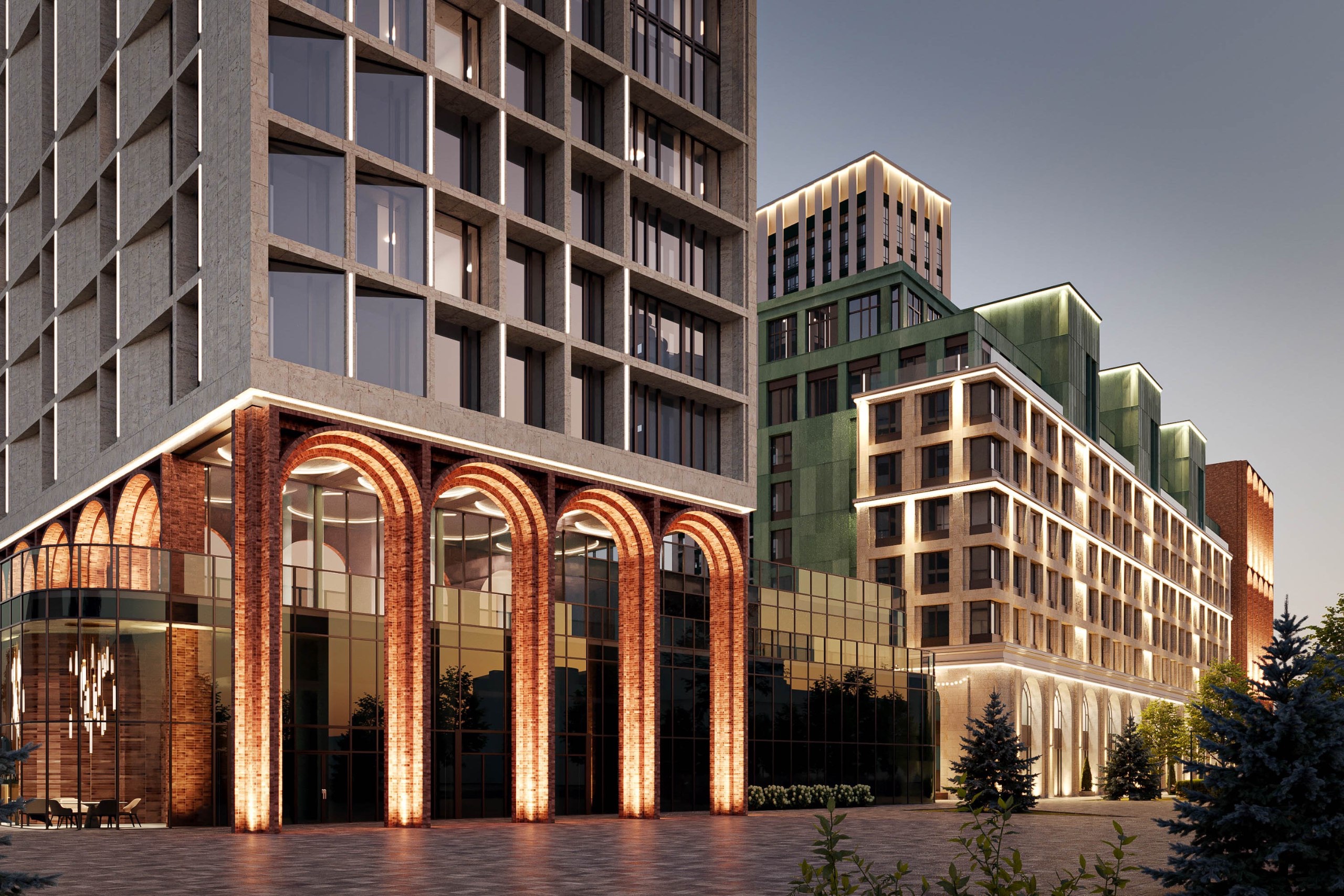Архитектура квартала вдохновлена классическими формами и переосмысляет архитектурное наследие. Характерной деталью проекта стали утонченные арки, которые переходят из экстерьера в интерьер центрального лобби, создавая цельную архитектурную композицию.