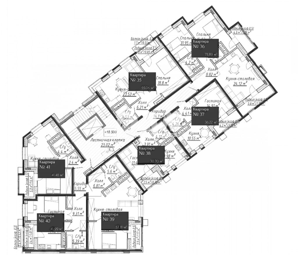 В проекте — квартиры с 1–3 комнатами, включая европланировки. Площади варьируются от 31 до 110 кв. м.