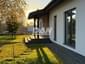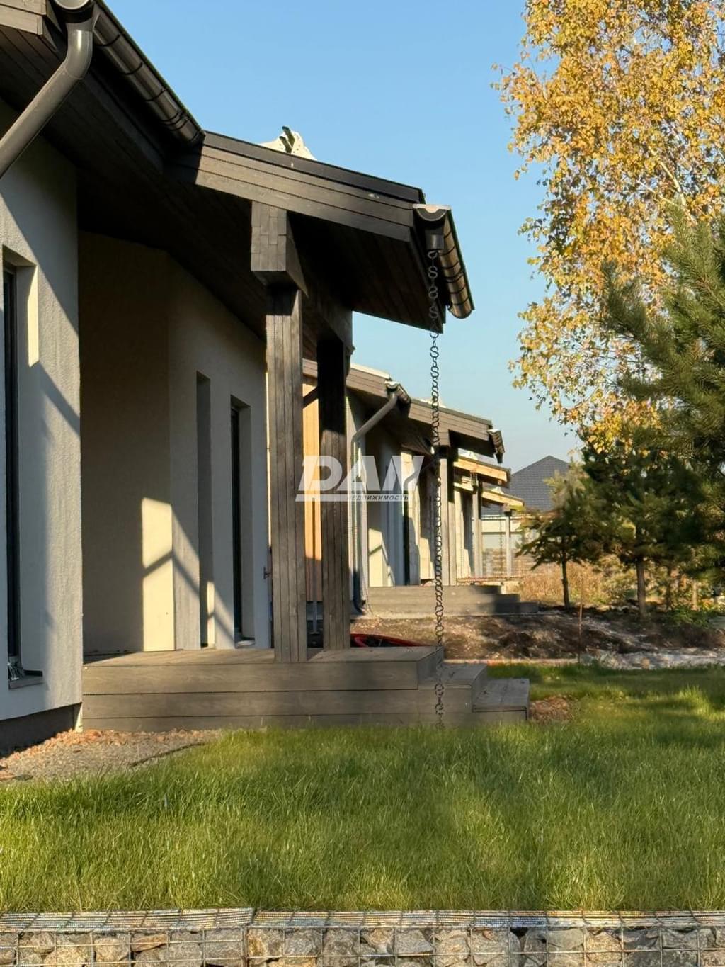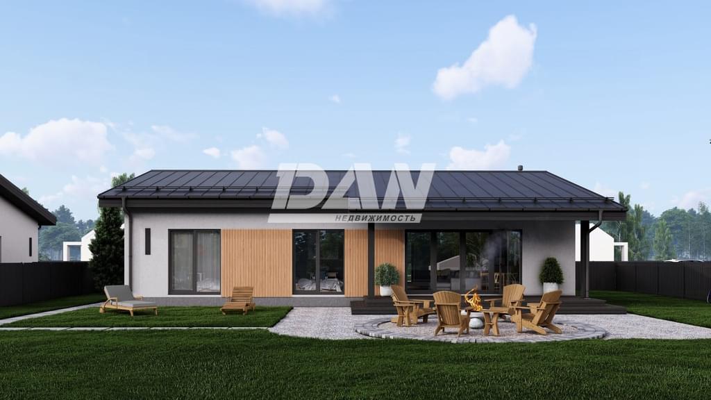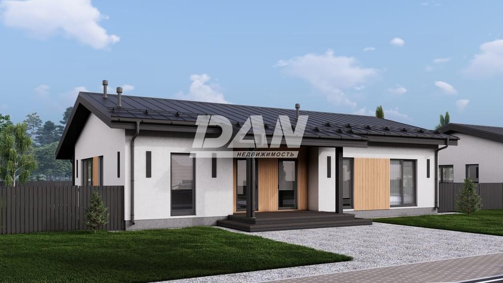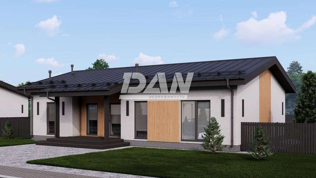 Фундамент - монолитная плита 300мм Стены - газобетон 300мм + утеплитель 100мм, декоративная штукатурка, вставки под дерево Кровля - весь сухой строганый пиломатериал, пленки и скотчи, покрытие кликфальц 0,5 мм, вентвыходы и фановый проход в кровле Свесы - отделка деревянным планкеном, покрытым маслом Водосточная система - графит Окна - профиль 74мм, мультифункциональные стеклопакеты Входная дверь - теплый алюминий 74мм со стеклом Законченный внешний вид дома, чистовая отделка фасада и кровли, терраса, забор.