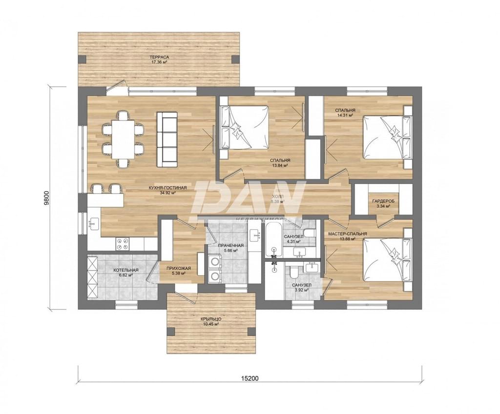 Внутренние инженерные коммуникации и чистовая отделка не входят в указанную стоимость, но наши проверенные подрядчики смогут реализовать любое ваше пожелание (на фото рендеринг чистовой отделки от дизайнера).
