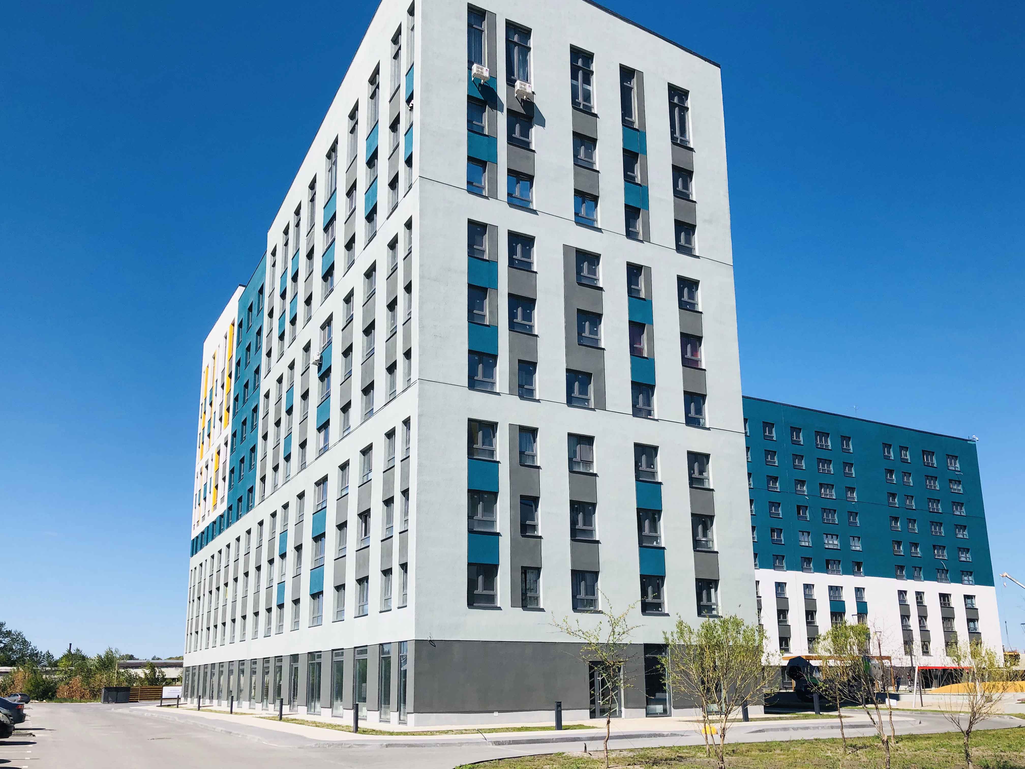 Микрорайон Акватория - это шесть монолитно-кирпичных домов от 6 до 10 этажей. Фасады домов оформлены в синем и белом цвете декоративной штукатуркой и керамическим кирпичом.